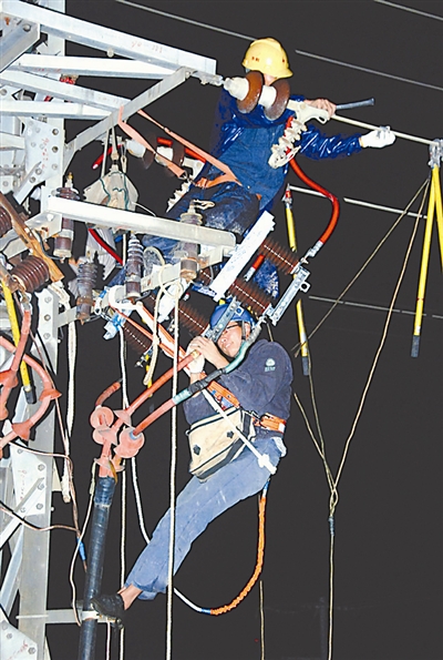 10月23日12时55分,今年第13号台风“鲇鱼”在福建漳浦县六鳌镇登陆,中心风力13级。受其影响,全县9万多户百姓停电。截至24日18时,国家电网福建省电力公司累计出动应急抢修队伍82支、人数1108人次、车辆161台次,派出现场安监人员82人次,受台风影响停电的用户预计25日全部恢复供电。图为23日电力工人在漳浦夜间抢修城区受损10千伏线路。