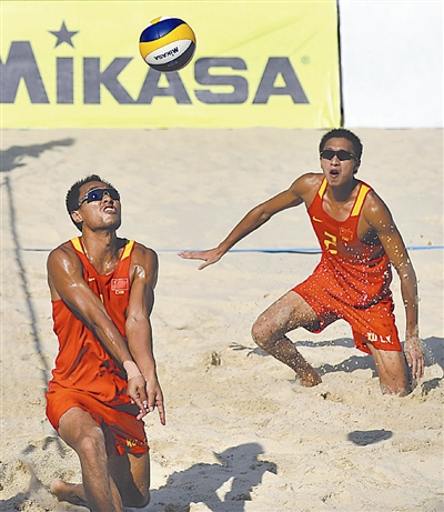 10月24日,吴鹏根(左)在比赛中救球。当日,在2010亚洲沙滩排球锦标赛比赛中,中国选手吴鹏根/徐林胤以2比0战胜印尼组合安迪/柯克,获得冠军。