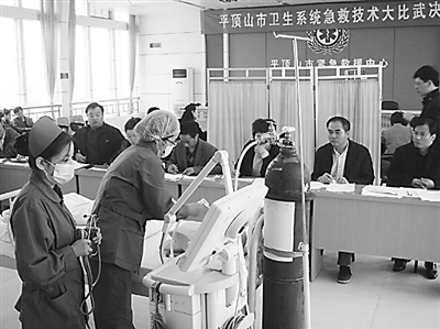 10月19日,选手在决赛中进行呼吸机操作。为提高医护人员应急救治水平,河南省平顶山市在全市医疗系统开展了急救操作专项比武活动。竞赛包括急救理论知识考试、呼吸机操作技术和静脉留置针操作,通过初赛共有16个单位近百名选手进入决赛。郑巍 摄