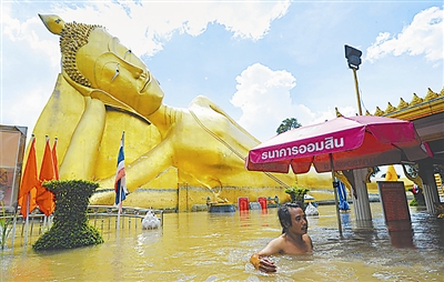 泰国正在遭受数十年来最严重的水灾,持续两周的洪水已波及全国32个府,目前已造成至少56人死亡,94万户家庭受到影响。 目前洪水已逼近首都曼谷,曼谷市面临严峻的抗洪形势。图为25日在暖武里府,灾民正在涉水逃难。吉平 供图