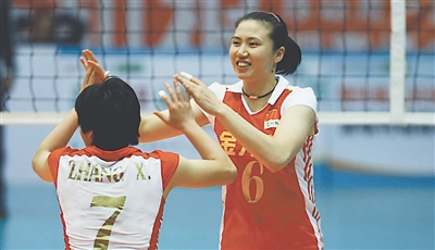 周苏红的回归给中国女排带来了希望。图为10月23日周苏红(右)在中国女排对塞尔维亚的热身赛中。