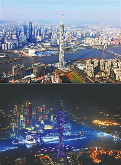 上图为10月29日航拍的广州新中轴线,江心的海心沙即将举办亚运会开幕式。下图为11月1日航拍的广州新中轴线夜景。