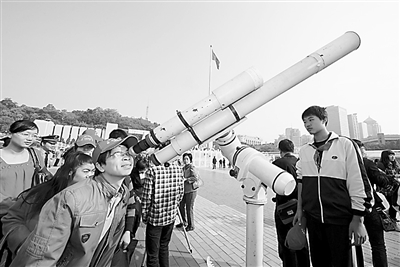 11月2日,福州市民在两岸科普嘉年华活动上体验天文观测。当日,第十二届中国科协年会科普活动启动仪式暨海峡两岸科普嘉年华活动在福州市五一广场举行,活动以“节约能源资源,保护生态环境,保障安全健康”为主题,来自台湾的8个科普机构带来15个科普演示、互动体验、动手做游戏等活动项目。新华社记者 姜克红 摄