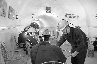 10月29日,广西百色矿务局东怀煤矿,矿工在160米井下的咖啡吧休息放松。矿工不仅能看电视洗淋浴,还能听音乐喝咖啡,让井下生活不再单调。 小鱼 摄