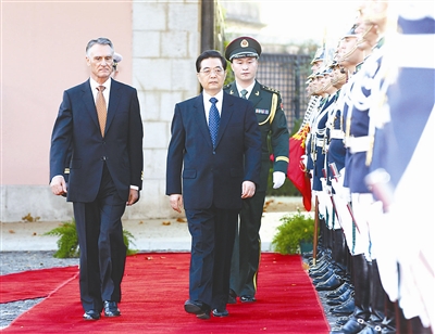 11月6日,国家主席胡锦涛在里斯本出席葡萄牙总统席尔瓦举行的欢迎仪式。 新华社记者 兰红光 摄