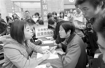 11月7日,重庆开展庆祝第四个“农民工日”活动。图为重庆市江北区观音桥广场,农民工正在咨询公租房相关政策。陈庆 摄