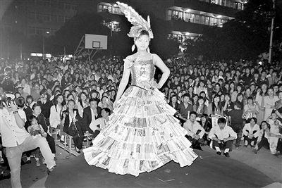 11月7日,广东省东莞市,一家日资电子厂正在举行“秀我风采杯”模特比赛,一位穿着用报纸折成裙子的外来妹在T台上向同事们展示时装与个人。在人力紧缺的情况下,厂方希望通过提高工资,举行文艺活动来留住年轻一代务工者。占有兵 摄