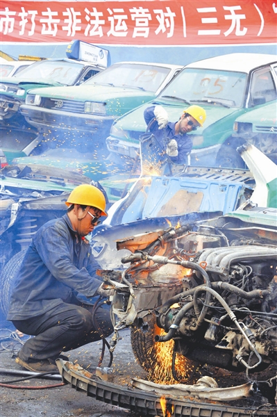 当日,贵阳市有关部门在该市城郊凤凰山市物资集团金属回收公司公开销毁无牌照、无发动机号、无车架号的“三无车”,以及“黑车”、“克隆”出租车共60辆,切实维护贵阳市营运秩序。 吴东俊 摄