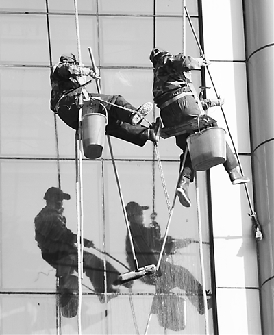 河北省邯郸市有一支20余人的“女蜘蛛人”保洁队伍,她们中年龄最大的近50岁,最小的已过30岁。她们工作时坐着一块木板,腰上挂着一个小桶,一手抓着绳索,掌握平衡,一手提着高压水枪,冲洗楼面的污垢。她们时而贴伏于楼面,时而双脚一点、腾空而起,动作熟练自如。新华社发(王九忠 摄)