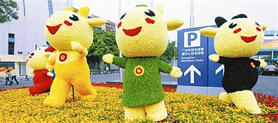 亚运会吉祥物造型组成的立体花坛扮靓广州城区街道。蓝山 摄