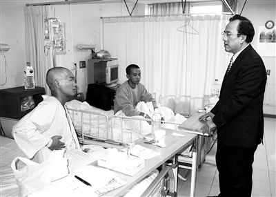 11月12日,在日本冲绳县石垣岛的一家医院,中国驻福冈总领事馆首席领事郭宝忠(右)慰问获救的中国船员纪长丰(左)和耿文磊。
