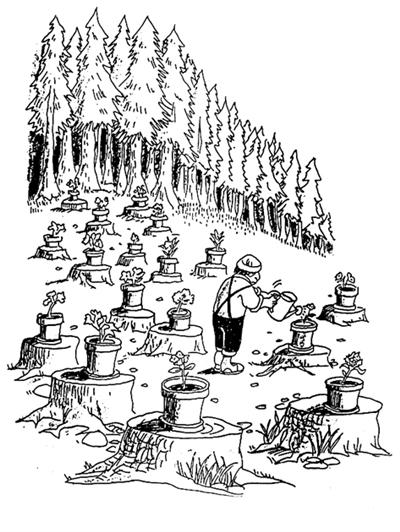 森林是地球生物圈中最重要的生境之一,它构成陆地生态环境的主体,并成为人类最初的摇篮。欧·亨利曾经说过:“当最后一片叶子落下时,生命就都结束了,我也得离开这个世界而去了。”这并非危言耸听。要保护好地球“绿色之肾”,当今只有以法律的手段来规范人们植树、护树和爱树的行为。任何诸如此类漫画中员工的“取巧”行为,都是非常暧昧、苍白和可笑的。