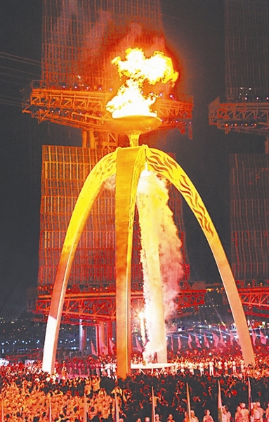 看到这两位手捧礼花的小朋友,何冲如释重负,他把礼花放到火炬塔前的地面上,用手中的火炬点燃了这个中国传统节日里孩子们最喜欢燃放的礼花。礼花喷出的绚丽火花一点点升高,星星礼花攀升到近28米时,点燃了主火炬。
