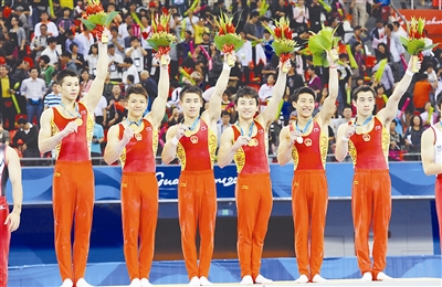 11月13日晚,广州亚运会第一个比赛日,中国男子体操队以368.500分的成绩,获得男子团体冠军,实现了中国队1974年首次参加亚运会以来在该项目上的“十连冠”。本报记者 许之丰 摄