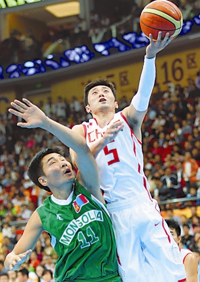 中国队球员刘炜(右)在比赛中上篮。11月16日,在广州举行的第16届亚运会男子篮球小组赛E组的比赛中,中国队以91比46战胜蒙古国队。 新华社记者 孟永民 摄