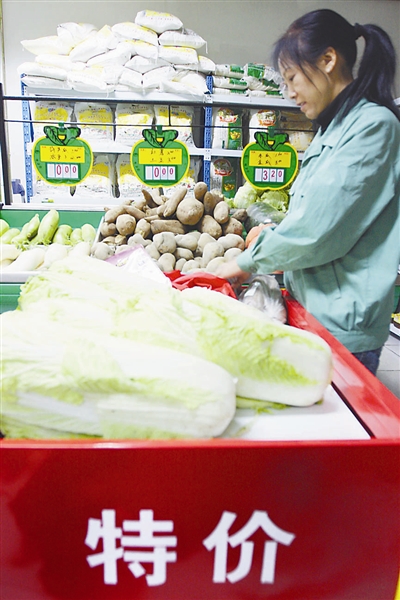 11月17日,新疆乌鲁木齐市水磨沟区王家梁社区蔬菜副食品直销店工作人员整理蔬菜准备销售。今年下半年以来,新疆乌鲁木齐通过政府搭建平台、企业运营、社区出人出力的模式,推行蔬菜直销店试点工作。政府指定的专业从事蔬菜副食品流通的企业直接为蔬菜直销店供货,以低价惠民,受到群众欢迎。