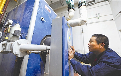 11月15日,在北京市东城区一处居民小区内,工作人员检查正在供暖的锅炉。