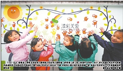 11月16日,建德市三都镇马宅村幼儿园的孩子们在幼儿园粉刷一新的墙上按上自己的彩色小手印。当日,浙江省萧山传化青少年教育基地的爱心志愿者们来到该幼儿园,为孩子们送去儿童玩具、书籍,并将幼儿园用彩色涂料粉刷一新,给孩子们营造出一个色彩缤纷的校园环境。 新华社记者 徐昱 摄