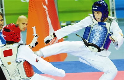 11月18日下午,广州亚运会跆拳道男子80公斤以下级决赛在广东体育馆举行,约旦选手纳比勒·哈桑以4比3战胜阿富汗选手内萨尔·艾哈迈德·巴哈维夺得冠军。本报记者 许之丰 摄