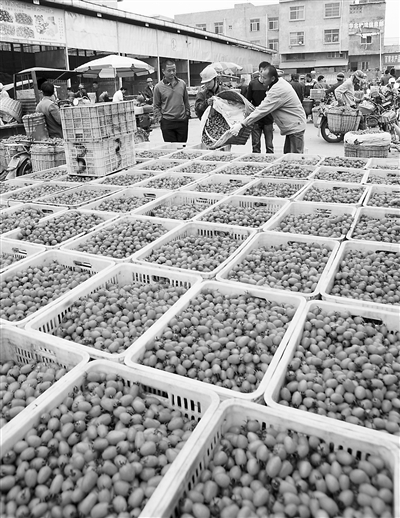 11月18日,菜农们在广西百色市田阳县百育镇蔬菜批发市场里销售西红柿。