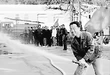 在11月17日武昌南机务段举办的消防月班组轮换培训演练中,消防教官毫不客气地数落着检修车间整备组职工李志:“看你把水喷哪儿了?不是水带松脱,就是喷嘴脱手,水管接头也没上紧……”而李志不仅不恼,反而憨厚地笑着。原来,消防操作环节多、要领难记,为此该班设计了“查纰漏”消防演练。专让教官吹毛求疵,职工在教官的“教训”中领悟和记住了操作要领。袁甫 摄