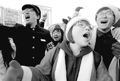 11月18日,韩国2011年度高考在82个考区的1206个考场同时举行,66.7万名考生参加了考试,比去年增加5%。图为在韩国首都首尔的考场外,学弟学妹们为参加考试的考生打气加油。吉平 供图