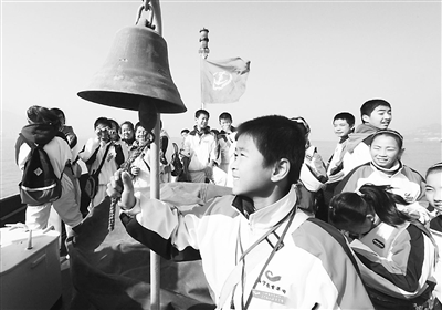 11月20日,在江苏连云港海事局举办的“认识海洋、体验航海”活动中,一名学生在海事巡逻艇上拉响船用锚钟。