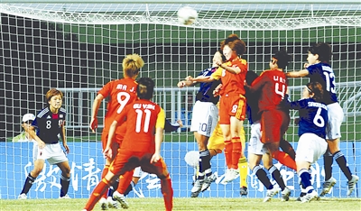 11月20日,在广州越秀山体育场,中国女足在半决赛中,以0比1负于日本队。图为双方球员在日本队门前争顶。本报记者 许之丰 摄