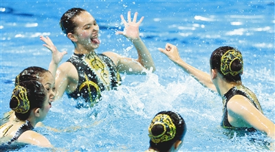 11月21日下午,广州亚运会花样游泳在佛山世纪莲花游泳馆进行了最后一项——组合项目决赛。图为香港花样游泳队在比赛中。