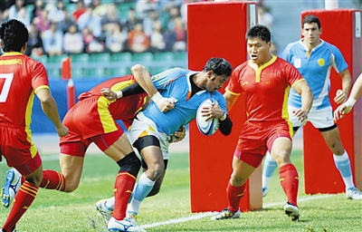 11月22日,橄榄球男子预赛中国队以61比0的比分战胜印度。图为中国球员成功拦截对方持球队员。本报记者 许之丰 摄