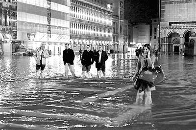 意大利近日暴雨不断,多个城市陷入水灾警戒。水城威尼斯再度浸泡在大水中。威尼斯22日一夜之间淹水水位就高达122厘米。图为当天在威尼斯城中,行人从被水淹没的街道上走过。