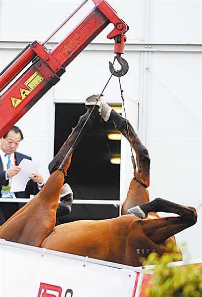 11月23日16时许,哈萨克斯坦选手加林娜·多尔古申娜在现代五项中所乘的赛马因伤势过重已被实施安乐死。这是死亡后的马匹被卫生处理车从比赛场地运走。