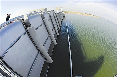 11月24日,一名记者正在青草沙水库的水闸上拍摄库区全景。