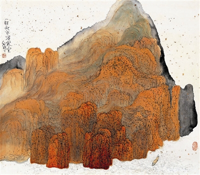 看朱道平的《清清湘西水》,可以读出其娴熟于大山水的大构图,洋洋洒洒,峰顺笔墨起,水自天外来;再读《一江秋水浸寒空》,构图满而张扬,仅余白少许点缀其间,却空灵悠远,看他原作并不大,暖色的山墨泼笔放,画中小舟一叶刻划精细,善用大笔勾勒细节,以满目暖色反衬清冷寒气,正是画家用色的奇处。《夕阳山外山》更是充分采用了传统散点结构、西法冷暖叠加的画法,层叠中冷冷暖暖反复着色,画面厚重不腻,只有对笔墨和西画兼有造诣才敢如此设色构图。朱道平无愧岭南大家,金陵一领军。(源源)