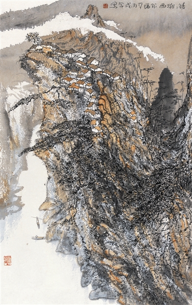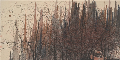求变求新立足创造是朱道平作画不变的追求。在他的作品中,看到的是激昂的笔墨,造险的构图,细腻的点缀;每每看到新作,同时感到熟悉和陌生,熟悉他摇动心津的大处落笔,陌生的是笔勾勒出奇和水气熏天的润泽。清奇本是中国文人画的专利,但在一幅画中,既润出清奇亦极尽洒脱,这是他山水画最令人流连忘返的笔墨妙处。