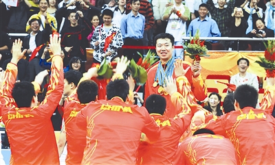 11月26日晚,中国队战胜韩国队夺得冠军。颁奖仪式后,中国男篮的所有队员都将金牌挂在了王治郅的身上,并“膜拜”他。在中国男篮,王治郅不止是大哥,还是英雄! 本报记者 许之丰 摄