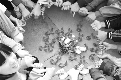11月27日,河南省南阳市第十六小学的学生与艾滋孤儿手挽手在一起。