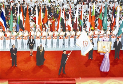 下一届亚运会举办城市韩国仁川的代表接过亚运会会旗。本报记者 许之丰 摄