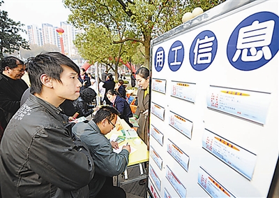 11月28日,一名青年在查看用工信息,当天共有1000多个面向下岗职工的招聘项目供求职者选择。