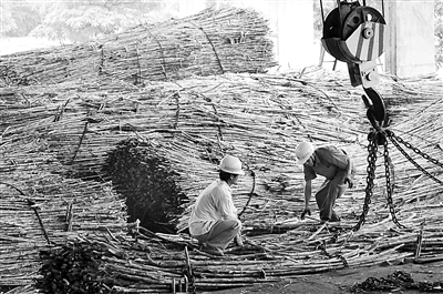 11月28日,广西防城港市上思县一制糖企业工人吊起甘蔗准备压榨。
