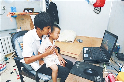 2010年8月,在青岛一建筑工地,一位年轻的农民工和弟弟在宿舍里用笔记本电脑看电影。本报记者 杨登峰 摄