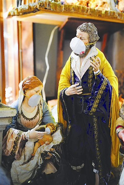 11月28日,在意大利的那不勒斯市区,人们给街头雕塑戴上口罩,讽刺垃圾成患。