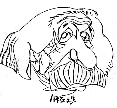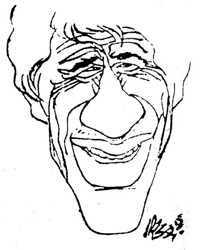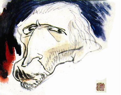 外国漫像多用明暗、体面来塑形象,有立体感。文兵以线来造形,把描绘的对象纳入到中国画笔墨规律中,变“自然形态结构”为“线条结构”,一点一线都是形体的艺术表现。他用线条勾画出以色列前总理佩雷斯的轮廓,只用四个墨点来表现眉和眼,有“画龙点睛”之妙趣。达·芬奇的大胡子有点特点,胡须的用线犹如奔泻的泉水,流露出这位文艺复兴艺术大师的智慧。而法国影星贝尔蒙多脸上的笑纹纵横交错,很幽默。我欣赏凡·高漫像,那橙黄色瘦削的脸和沉陷的眼睛流露出深沉的痛苦和忧伤,背景渲染成强烈的红蓝对比色,更能展示这位印象派大师热爱阳光、热爱生活的个性。在创作中,文兵用长短、粗细、干湿、浓淡各种不同的线条来造像,又以点、擦、皴、染来加强效果,线条和墨色的变化分布,就像音乐的强弱拍节一样,有节奏感。这种强化了的形象,无中生有的点线面和笔墨是一种艺术的再创造,洋溢着画家的幽默情趣。