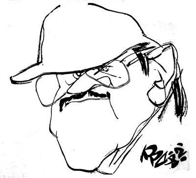 文兵画头像,不用道具和服饰作陪衬,善于用人物面貌特征、精神气质来表现幽默。作画时把观察对象的第一感觉放在首位,抓住特点加以扩大或缩小,加以强化或省略,夸张的幅度很大,变形又符合解剖关系。笔墨用在能显示人物个性之外,将人物刻划得惟妙惟肖。中国球迷都非常熟悉的足球教练施拉普纳,他的造像很有趣,眉眼口鼻缩小到只占头部五分之一的位置,在大帽沿下,露出紧张又有点自信的神气,其他部位则完全省略,这种淡化是为了深入刻划。这既有西画在准确基础上夸张的技巧,又有中国画的写意手法,寓准确于不准确中,妙在似与不似之间求神似,而富有观赏性。