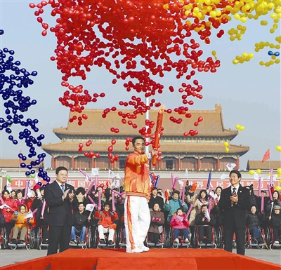 红绸翻飞,彩带飘舞,天安门广场成为欢乐的海洋。伴随着威风锣鼓急促的鼓点,20名火炬手依次传递火炬,尽情抒发人们“残健共融”,共建和谐社会,共创美好未来的崇高理想。