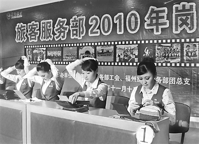 日前,厦航福州分公司生产基地多功能厅内济济一堂,厦航福州旅客服务部在这里举行了岗位练兵大赛,内容涉及业务抢答、登机占牌、舱单复核、快速更换椅套、广播词考核、头等舱服务考核、机上急救、突发事件及危机处理等,近3个小时的时间里展现了旅客服务部1年来岗位练兵的成果。图为空姐比赛化妆现场。本报记者 吴铎思 通讯员 林强