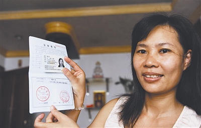 中山“新市民”谢红芬展示她的户口簿和身份证。南吴 摄