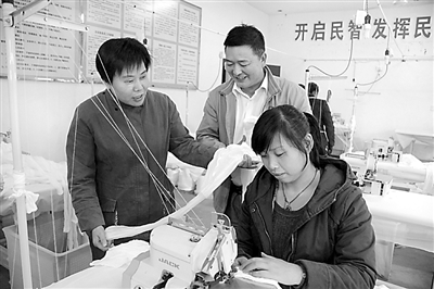 浙江省开化县总工会关爱劳模送“恒温”。他们不仅在节假日走访慰问劳模,平时也十分关心劳模的工作与生活,为劳模在生产生活上排忧解难。图为县总工会主席詹金女(左一)走进全国劳模郑初一新办的制袜厂,为劳模出谋划策解决企业在招工等方面遇到的难题。