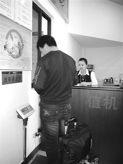 旅客乘坐直升机前,除了常规安检外,还需要称重,图为旅客测量自己及随身行李的重量。