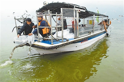 12月8日,10万尾金线鱼被放入昆明滇池,治理滇池污染。金线鱼学名为滇池金线鲃,是滇池的土著鱼类,为云南四大名鱼之一,国家二级保护动物,曾广泛分布于滇池流域。自上世纪80年代以来,由于污染,金线鱼种群在滇池主水体已经灭绝,金线鱼能在一定程度上保护浮游动物,从而抑制蓝藻等浮游植物的生长,改善滇池水质。任东 摄